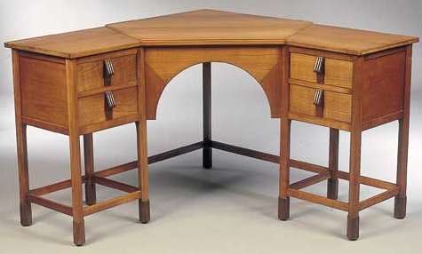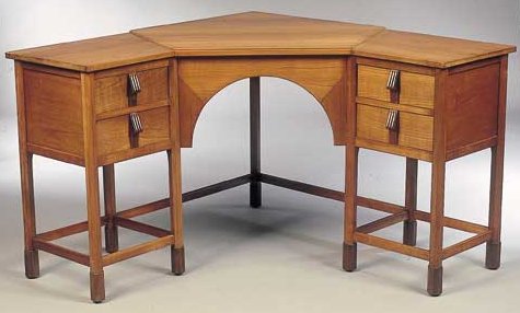 the shaped top above an arched kneehole flanked by four drawers with reeded handles, the whole raised on square section chamfered legs united by stretchers and terminating in turned and factetted feet, bears maker's label:"This piece was made throughout by Gordon Russell Ltd at Broadway , Worc., design no: 705, designer: Gordon Russell, Foreman: F Shilton, Cabinet Maker: R France, Date: 4.6.30"