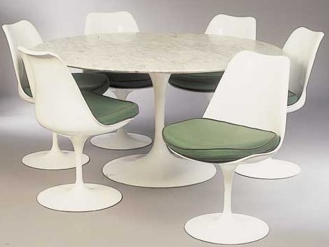 designed for Form International after Eero Saarinen, comprising a circular marble top table and six 'tulip' chairs, each of white moulded form with squab cushion and flared pedestals (7)