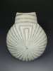 coiled stoneware, flask form with tapered neck, radiating celadon lines on a buff glazed ground, impressed monogram