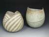 coiled stoneware, swept rim, celadon swagged lines on a buff glazed ground, impressed monogram, 24cm high; A JOHN WARD (BORN 1938) OVOID VASE, 1980S, coiled stoneware, square body with lobed rim, celadon spiral lines on a buff glaze ground, impressed monogram, 21cm high (2)