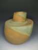 coiled stoneware, flat shoulders with round neck, modelled 'leaning', banded mottled green, ochre and brown glazes, impressed monogram