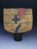 stoneware, on pedestal foot, ochre ground with an abstract design, signed on base