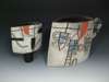 stoneware, solid auricular single handle, trailed slip abstract design, signed on base, 34cm wide; A JOHN MALTBY (BORN 1936) OVAL VASE, 1980, stoneware, on pedestal foot, abstract design, signed on base, 23.5cm high (2)
