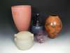 magenta polished exterior with irregular scraffito lines, incised signature to base, 37cm high; A DUNCAN ROSS TAPERED OVOID VASE, burnished terra-sigillata, black geometric line design, incised monogram to foot27.5cm high; IDEN POTTERY, RYE BOTTLE SHAPED VASE, 1980S, glazed earthenware, dark blue/black neck and powder blue body, printed mark, 19.5cm wide; S.W. (UNTRACED) OVOID JAR AND COVER, stoneware, scraffito diagonal and vertical lines, lug handles, 19.5cm wide; S.J. POND-SMITH STUDIO GLASS BOWL, pale cranberry metal with inset green and gilt foliate motifs, signed on foot rim, 13cm wide (5)