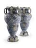 salt glazed earthenware, each of shaped baluster form with loops to the rim, impressed to the body with allover floral designs, impressed marks '2416' ( minor damage to rim of one vase) (2)