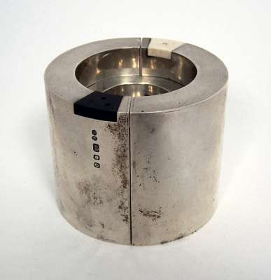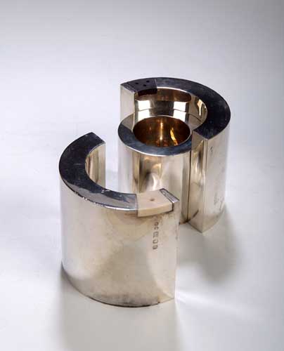 silver, ivory and ebony, comprising a mustard dish of cylindrical form with dished bowl, and a salt and pepper each of crescent form with unstained ivory and black hardwood removable lids with pouring apertures, each fitting around the mustard to form a cylinder, hallmarked London 1969-70 (3)
