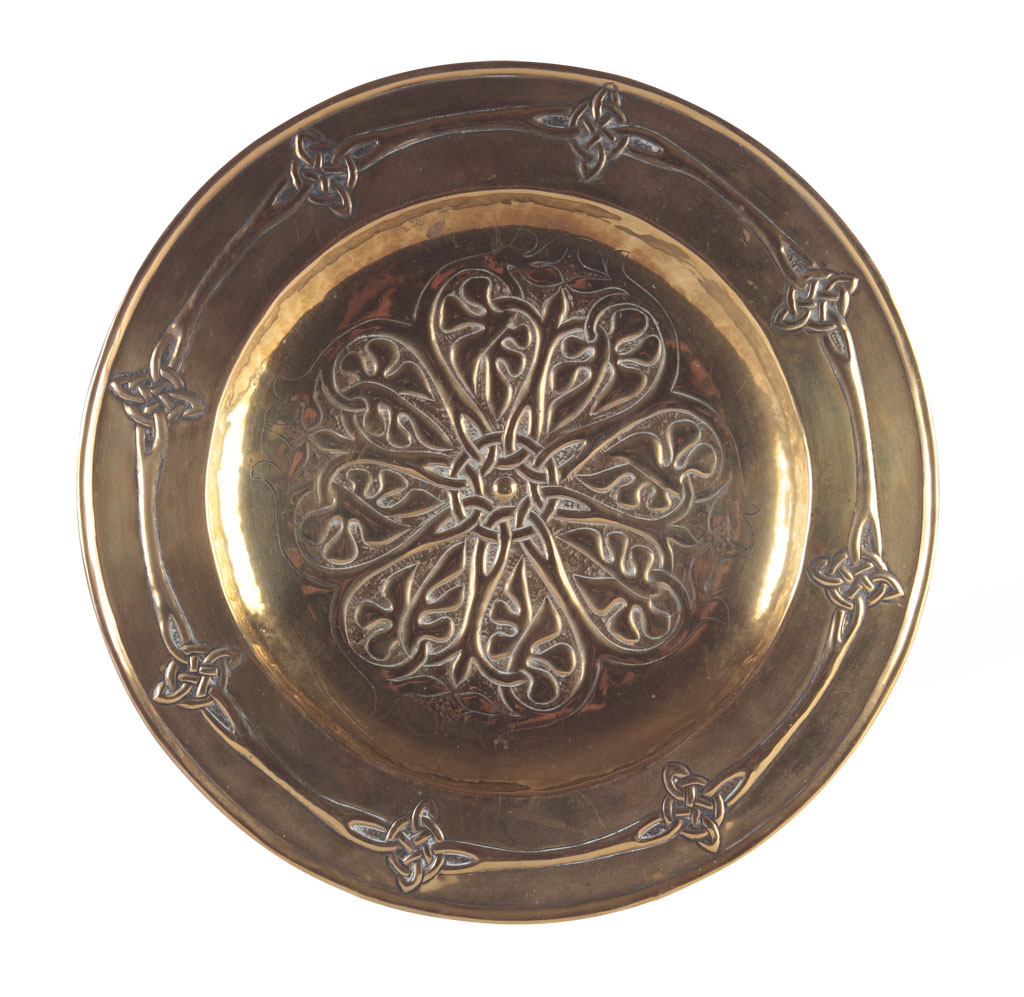 brass, repousse decorated with a band of Celtic knots and enclosing a foliate panel