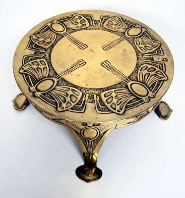 brass, repousse decorated with stylised dragonflies and plant forms, beard monogram