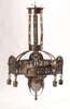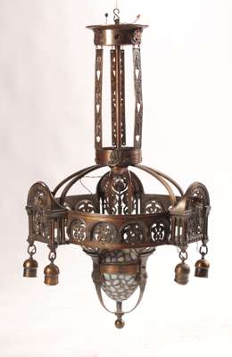 bronzed metal and opaline glass, the moulded corona and triple openwork supports united by an openwork foliate band from which hang six bell-shaped glass shades, centred by a leaded opaline glass shade