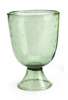 green glass, tapering cylindrical form with spreading foot and bubble inclusions, etched mark