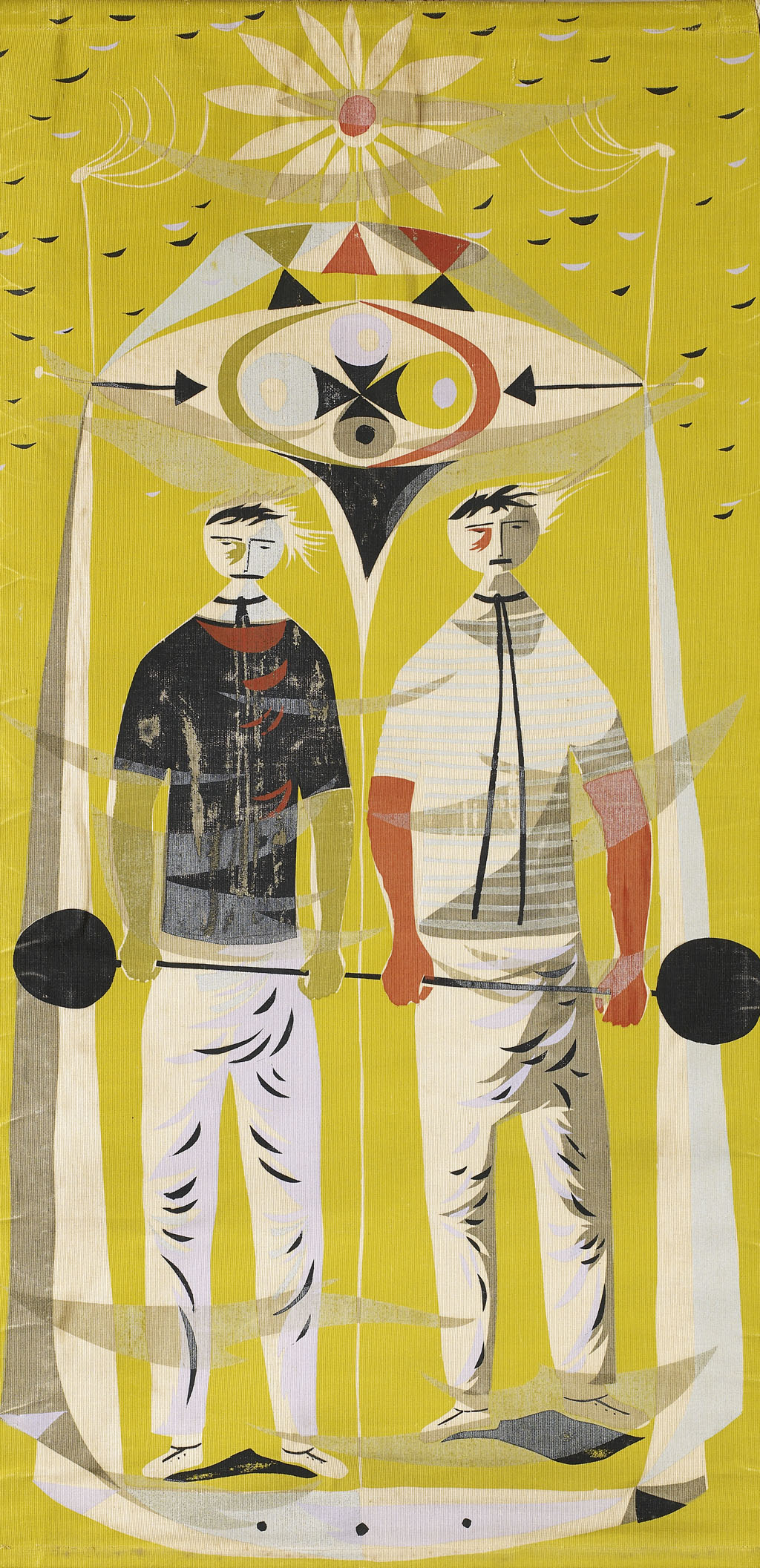 Note: Centrapetal design motif is similarly apparent in the screen-printed panel (P.68. Ibid) Mary Schoeser in the same text describes Stewart's 1950s textiles as "...drawing from an oeuvre that was consistently humane, dealing with the human form, face and features... Stewart tapped into cultural iconography representative of individuality, risk-taking and idealism that were, on the one hand, particularly Scottish and socialist, and on the other, universally understood." (P.67. Ibid)
