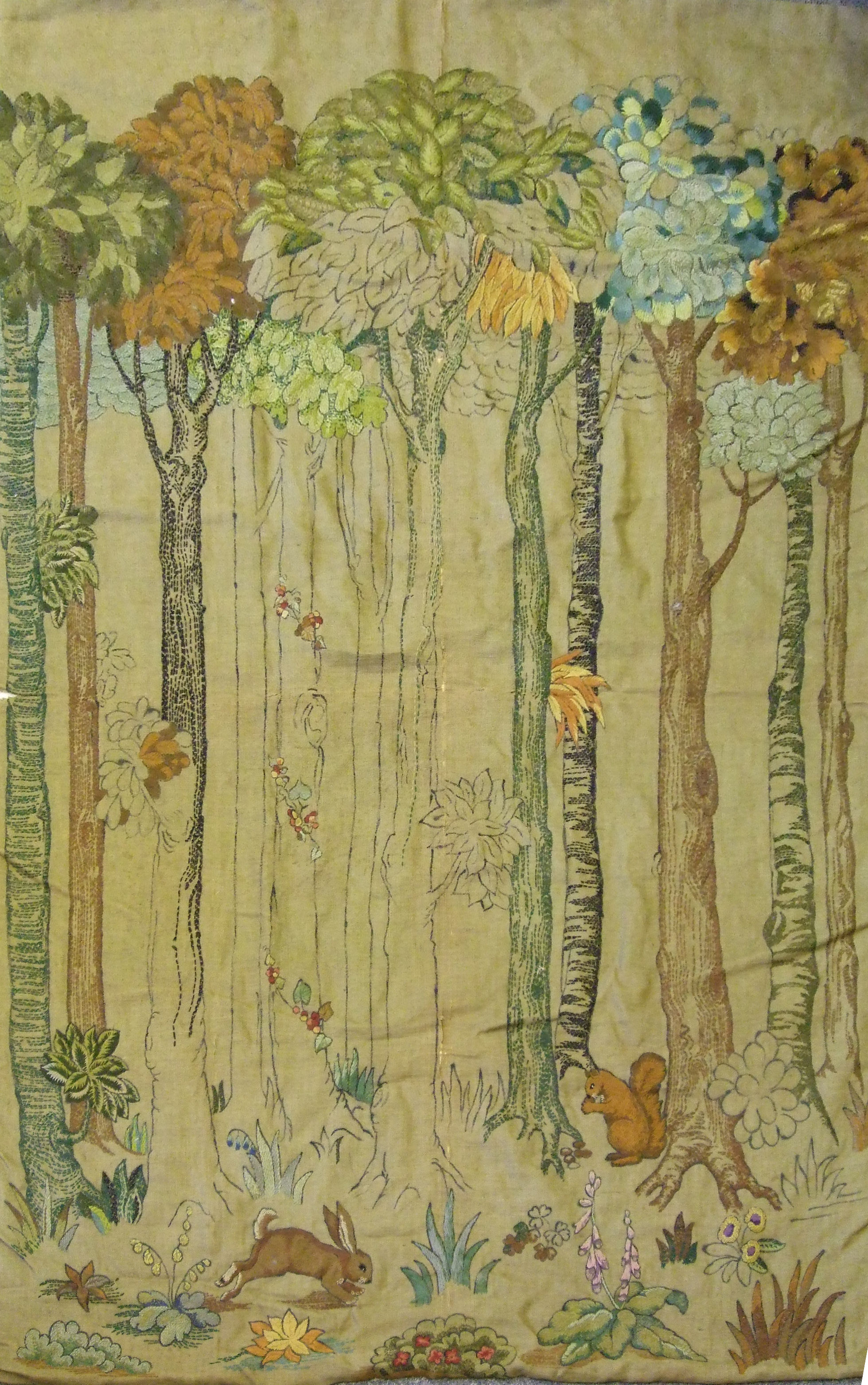 coloured wools on linen, depicting a woodland scene with stylised trees, plants and animals, modern linen backing