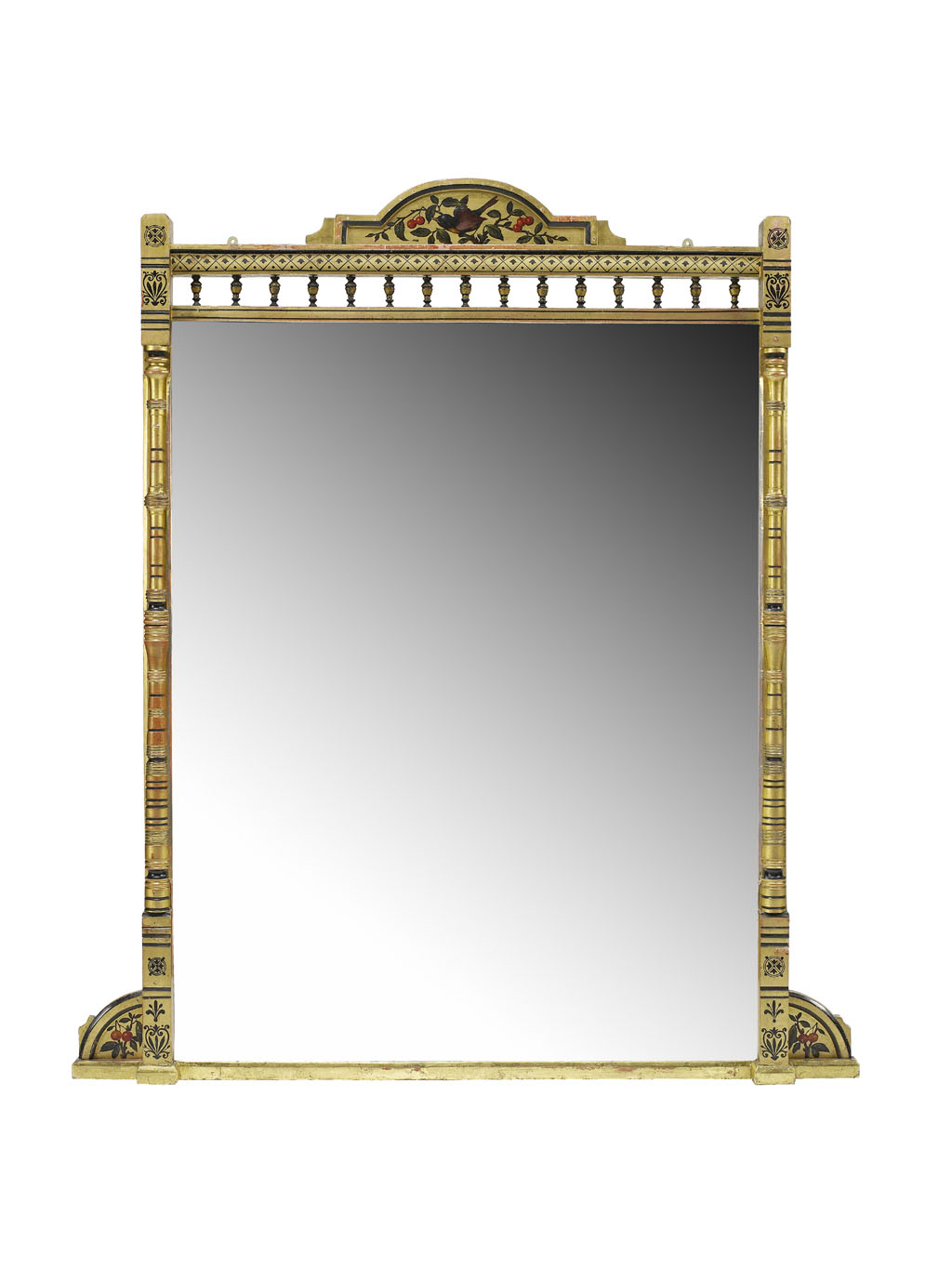 gilt and gesso, the rectangular plate enclosed within gilded frame with arched cresting, painted with birds in cherry branches, above a spindle gallery, with turned column supports and bracket supports