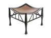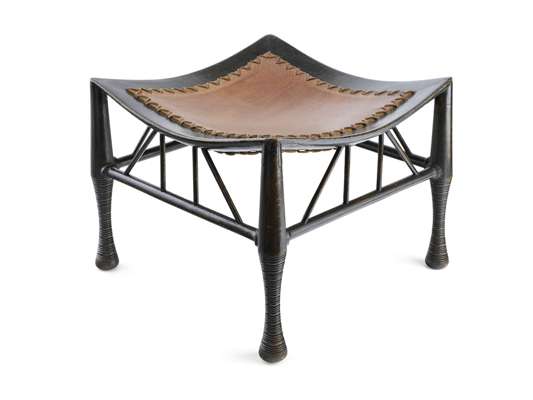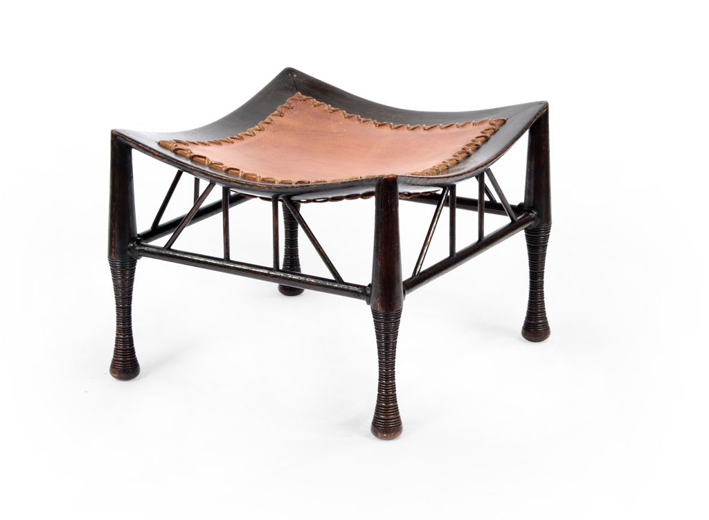 stained oak with leather, the dished leather seat raised above shaped and turned legs linked by stretchers