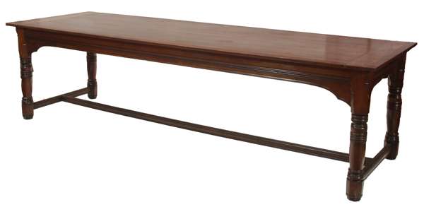 mahogany, the rectangular planked top above a reeded and arched frieze, raised on baluster turned legs united by a stretcher