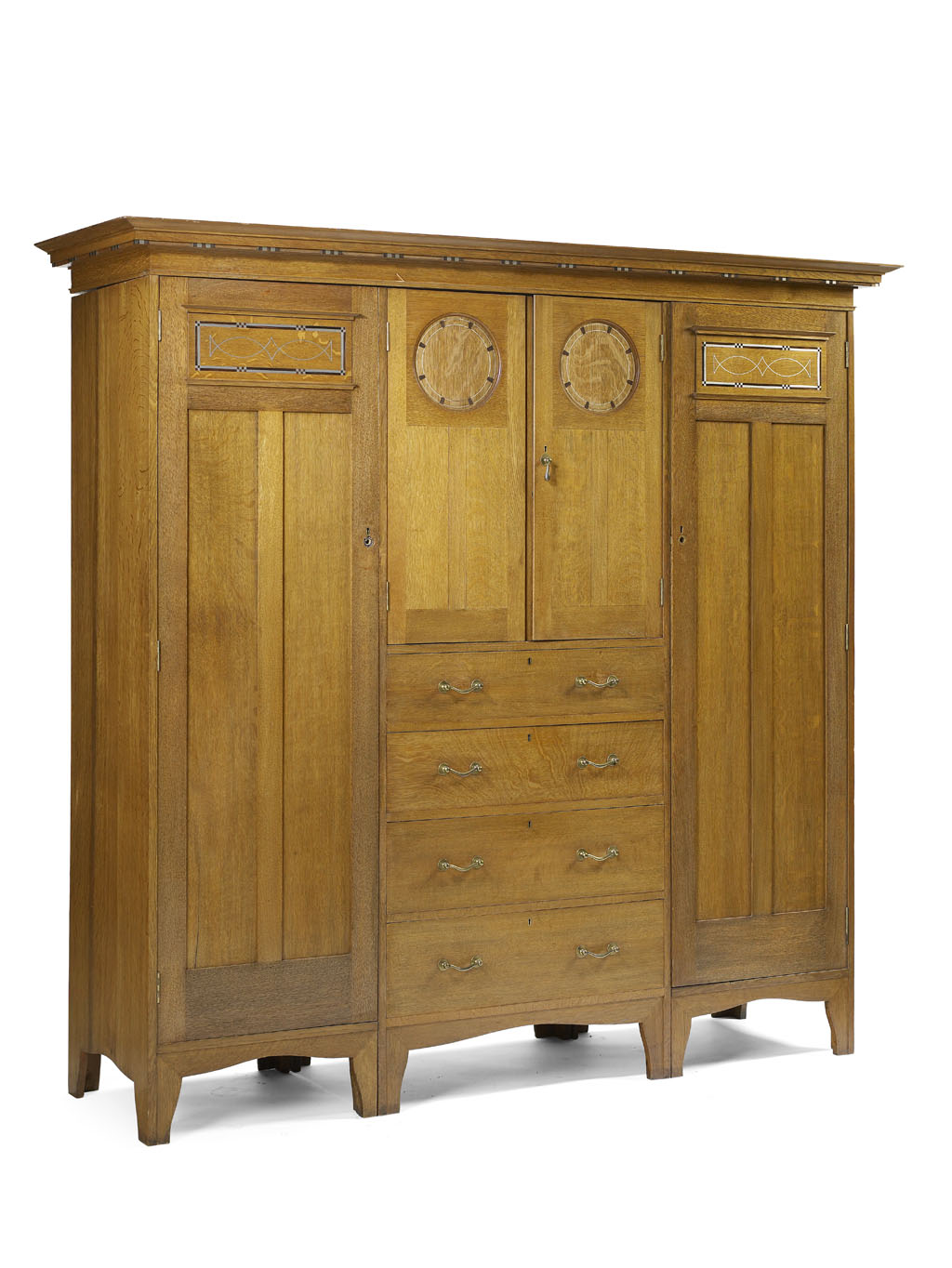 inlaid oak, comprising a wardrobe, the moulded cornice chequer-inlaid with pewter and ebony, above two central cupboards with inlaid roundels and with drawers below, flanked by mirrored doors, 201cm wide, 206cm high, 62cm deep; also a dressing table with rectangular top, surmounted by an arched swing mirror above two drawers on tapered and turned legs, 107cm wide, 153cm high, 53cm deep; three bedroom chairs; and a pair of single beds, 95cm wide (7)