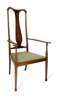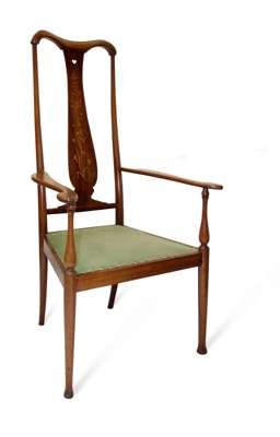 inlaid mahogany, the moulded serpentine top rail above tall baluster splat inlaid with a marquetry penwork design of wild flowers, the shaped arms on ring turned baluster supports enclosing an upholstered panel seat on turned and tapering legs with flared feet