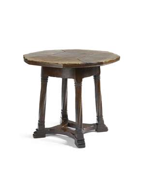 oak, the octagonal sectional top with pegged construction raised above wrythen twisted columns and linked by curved stretchers on bracket supports