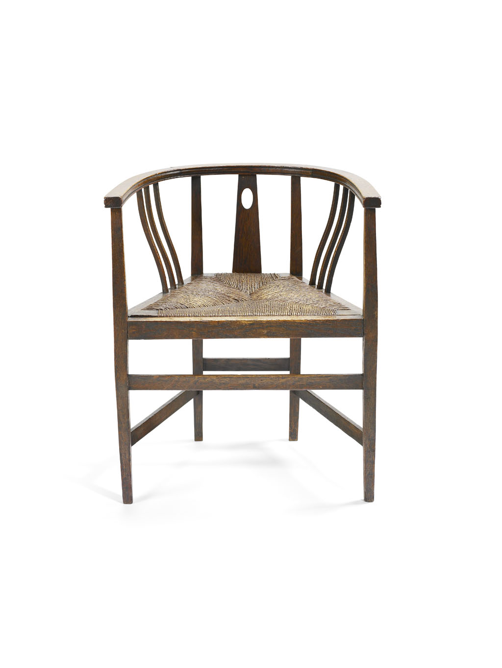 oak, with curved splat back above drop-in rush seat on square tapered legs linked by stretchers
