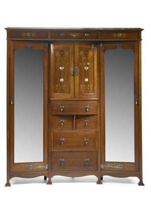 inlaid mahogany, with projecting panelled cornice inlaid with specimen woods and mother of pearl roses above central bowed doors, similarly inlaid, a single bowed drawer and two short over two long drawers below, flanked by mirrored doors, the whole raised on square legs with moulded feet