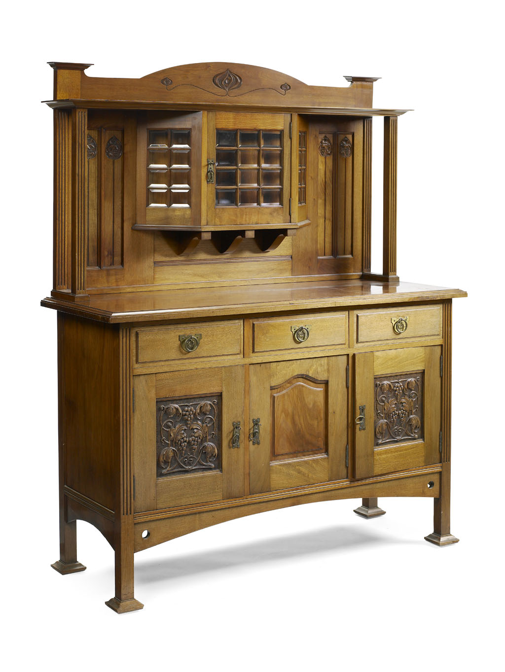 walnut, the back with central astragal glazed cupboard flanked by carved panels, the base with rectangular top above three drawers and doors with vine-carved panels, the whole raised on square feet