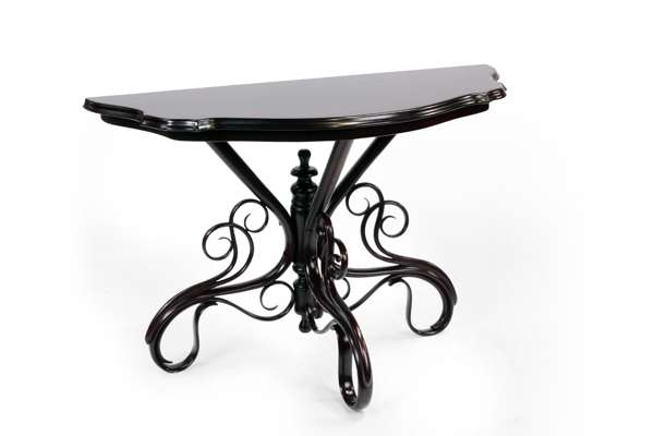 stained bentwood, the serpentine top raised on three elaborately scrolled supports