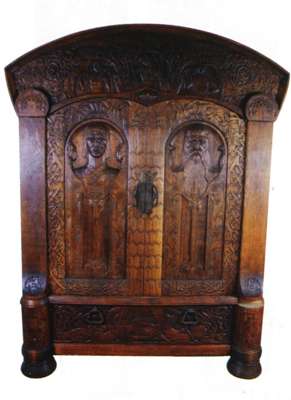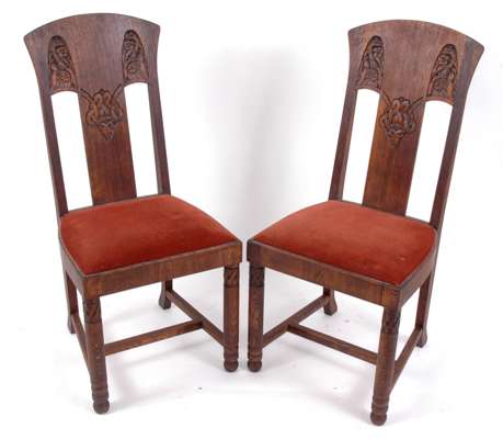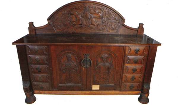carved oak, comprising a sideboard, with two central doors flanked by four drawers, 200cm wide; an armoire with twin doors above a single drawer on turned feet, 236cm high; a dining table and twelve matching chairs, including two carvers, each piece shallow-carved with Celtic knotwork and with male and female figures (15)