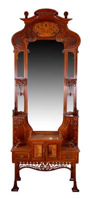 inlaid mahogany, with central bevelled plate enclosed by inlaid cresting and open shelves above a base with four panelled doors with pierced apron below, square tapered legs
