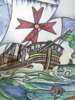 glazed earthenware with brass frame, printed in blue on white in the manner of Walter Crane with a maiden by a lake, moulded marks, 15cm square; also a THREE TILE PANEL, in the manner of William de Morgan, depicting a galleon in full sail, with swimming fish below, each tile 15.5cm square (2)