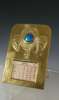 brass, with inset Ruskin ceramic panel, of rounded rectangular outline, repoussé decorated with stylised plant design, bears monogram