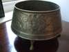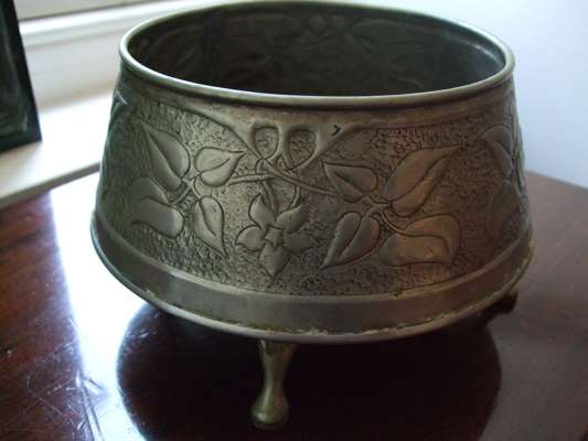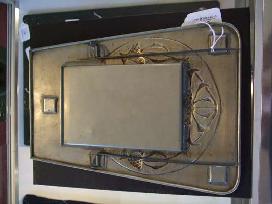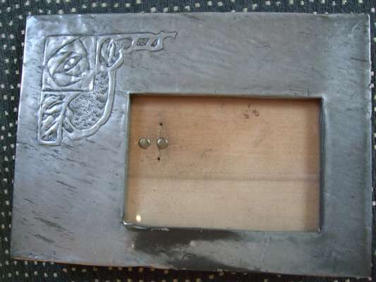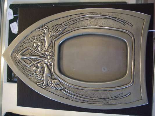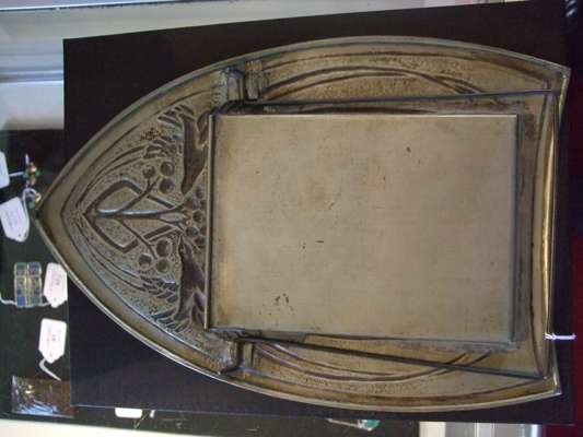 tin, one of lancet arched outline, repoussé decorated with opposed birds and fruiting branches, 29.5cm high; the other of tapering rectangular outline, set with red enamel and repoussé decorated with stylised thistles, 19.7cm high; also a tin jardinière, repoussé decorated with a frieze of flowering foliage, and a further tin photo frame (4)