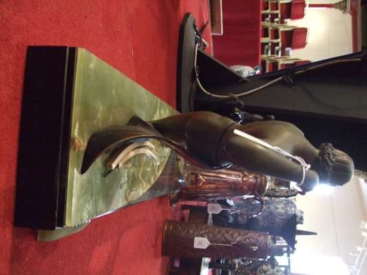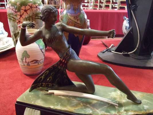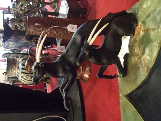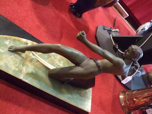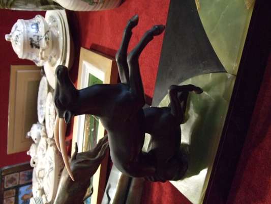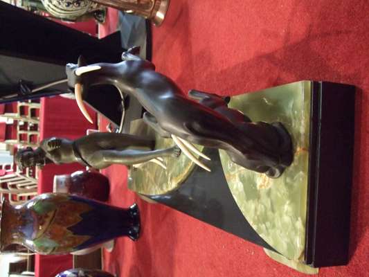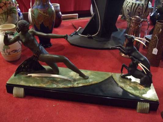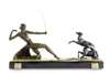 patinated spelter, bronze, ivory and onyx, depicting a female hunter and and her prey