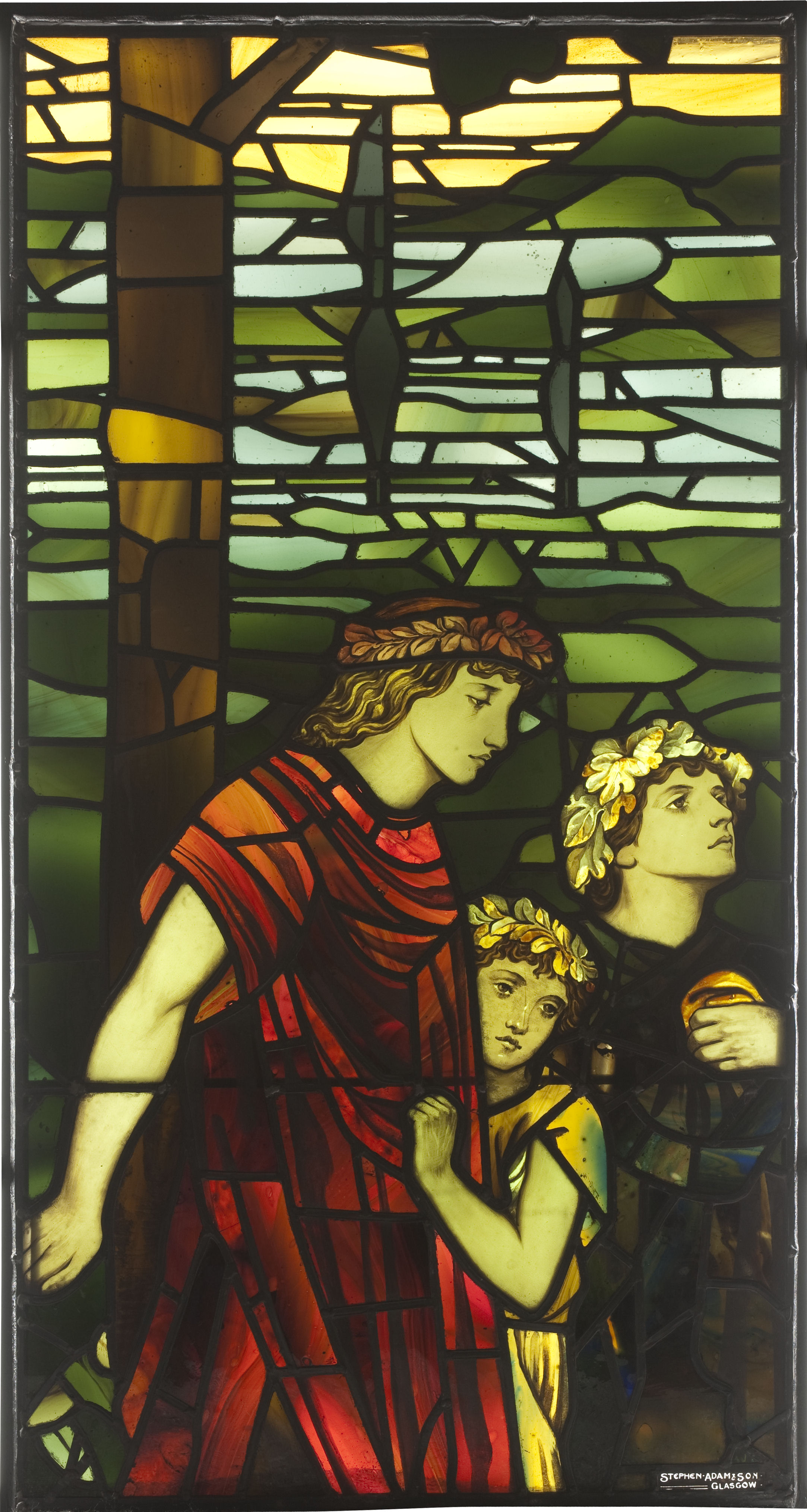 Note; Stephen Adam (1846-1910) established his studio in Bath Street, Glasgow in 1870. He was responsible for much of the finest stained glass produced in the country for the next forty years. Much of his secular glass, such as the present window, was commissioned by the newly wealthy Scottish industrialists and shipping magnates. Adam's equally talented son, also Stephen, left for America after a bitter quarrel with his father.