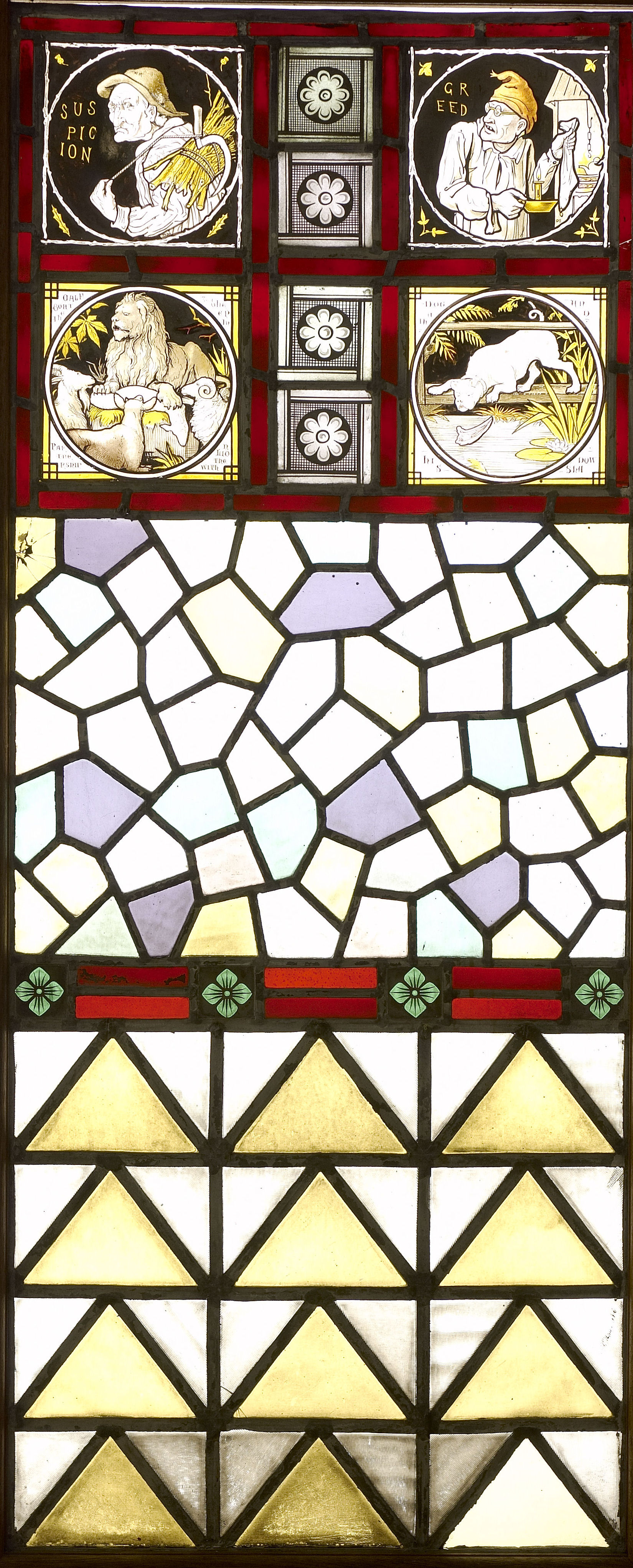 each with four pictorial panels, based on Aesop's Fable designs for Minton's, above geometric panels, entitled; 'Contentment', 'Ambition', 'King Log and King Stork' and 'The Tortoise which wished to learn to Fly' 'Affection', 'Ignorance', 'The fox dines with the stork' and 'The fox and the goat in the well' 'Rage', 'Terror', 'The ape, the cat and the roast chestnuts' and ''The lion and the rat' 'Suspicion', 'Greed', The goat, calf and sheep in partnership with the lion' and 'The dog and his shadow' (4)