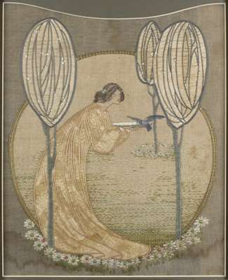 silkwork on linen, depicting a maiden in a garden, later framed and glazed