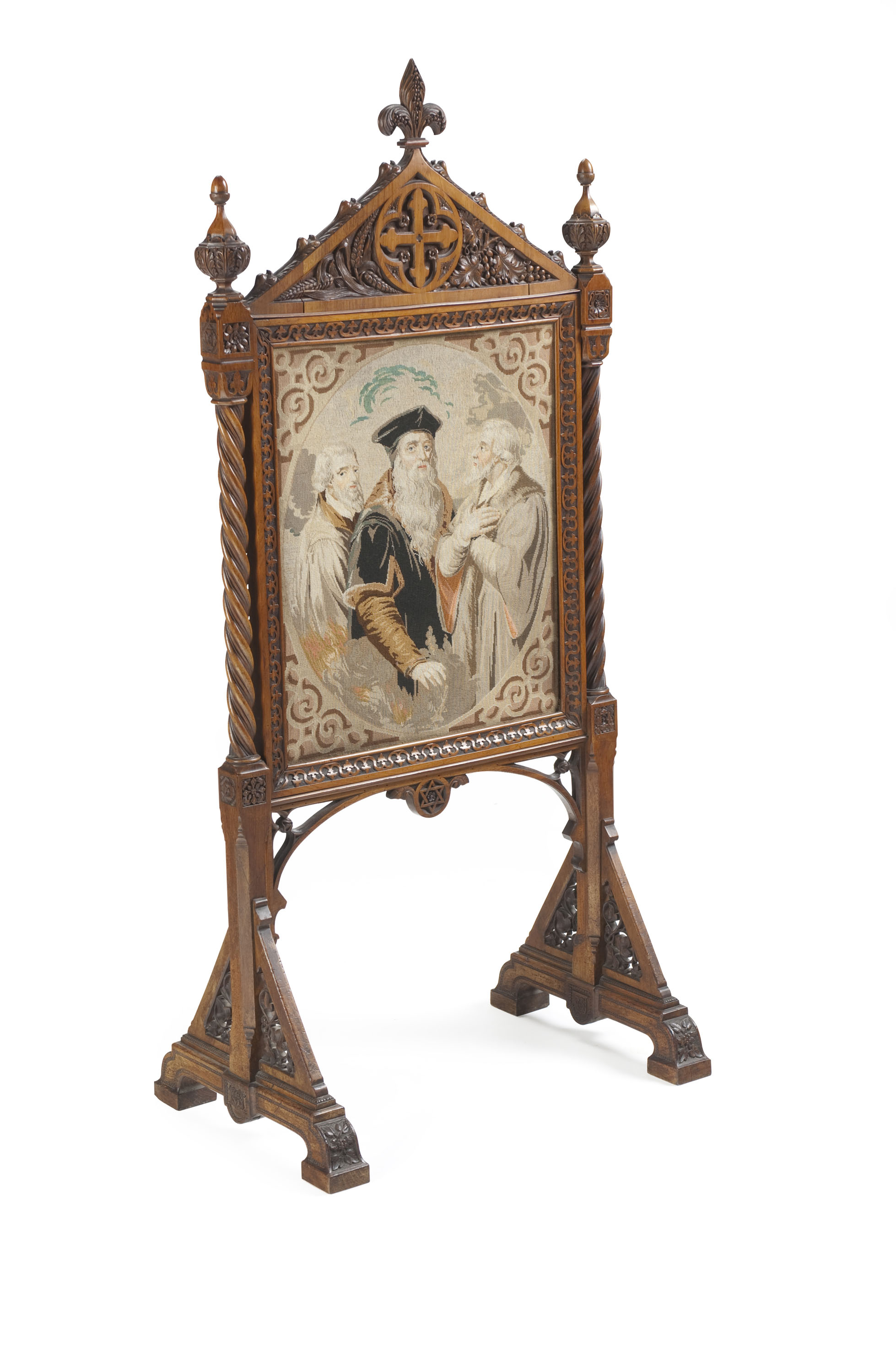 walnut, elaborately carved, the pedimented top rail with fleur de lys finial and barley and vine panels above a woolwork panel enclosed by leaf carved frame and wrythen twist uprights, raised on supports with pierced brackets and leaf-carved bracket feet