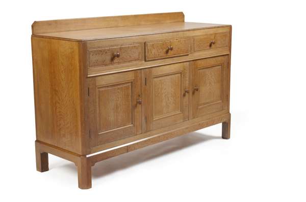 limed oak, the canted rectangular top above three panelled drawers below on canted block feet, bears makers label