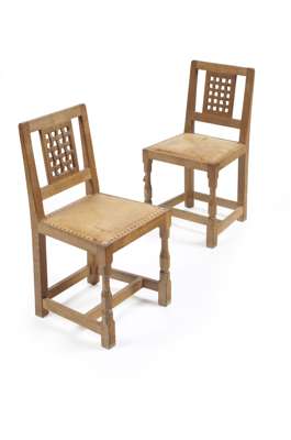 oak, each with 'woven' lattice backs above leather upholstered panel seats on facetted turned and blocked legs linked by stretchers (8)