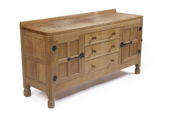 oak, the rectangular top with canted angles above three central drawers flanked by panelled cupboard doors with iron hinges and raised on turned and facetted legs, carved mouse signature