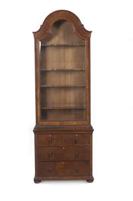 walnut veneered, the projected moulded arched cornice, over a glazed door enclosing shaped shelves, two short over two quarter veneered drawers with cast bronze dolphin handles, raised on bun feet