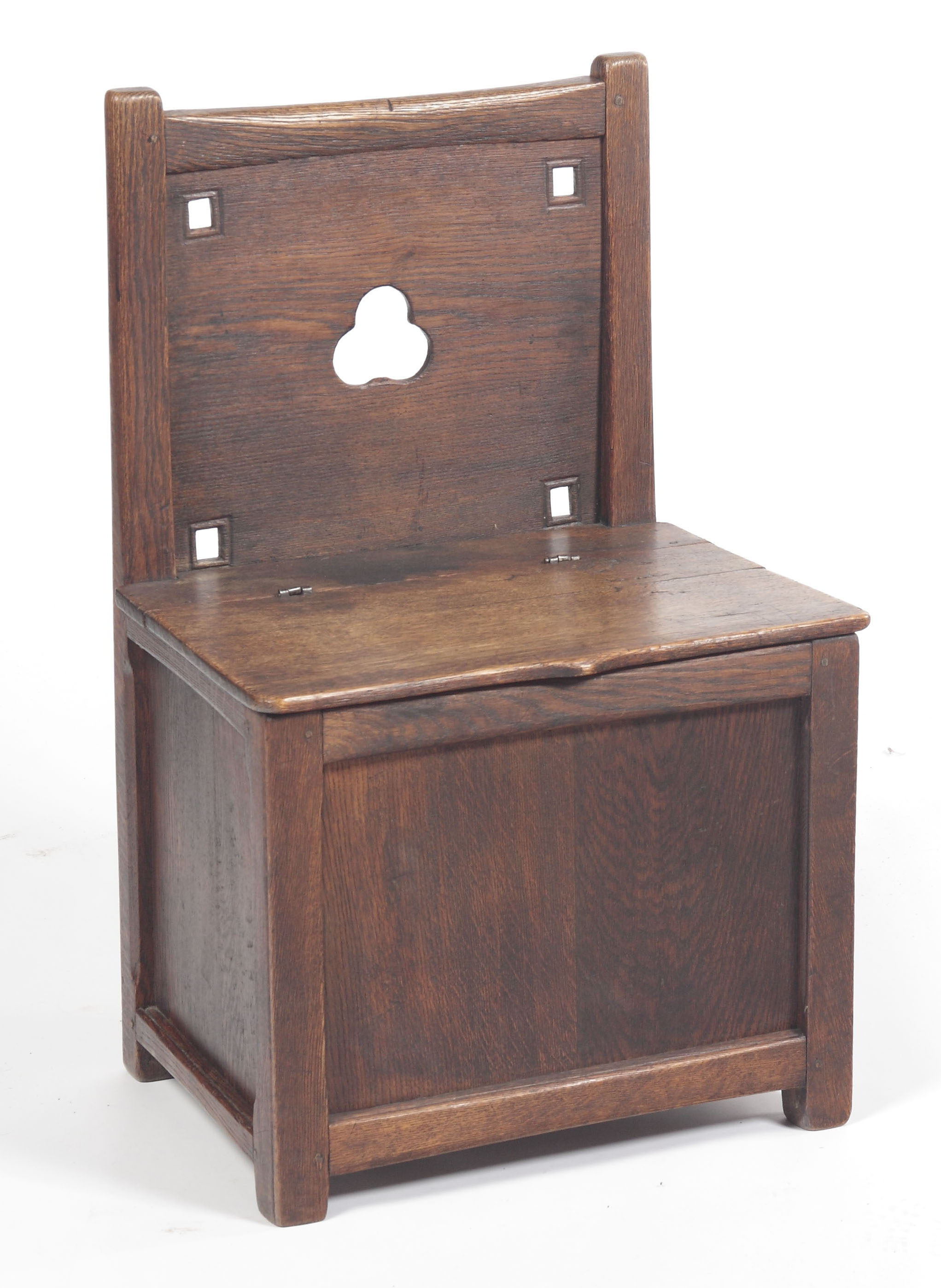 stained oak, the square back with inset panel, pierced with trefoil motifs, above a shapes and hinged solid seat enclosing a void, solid sides