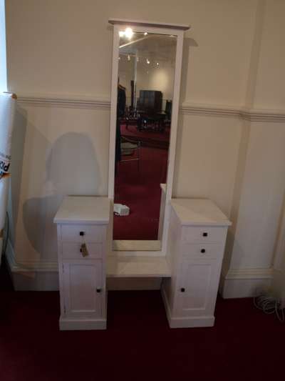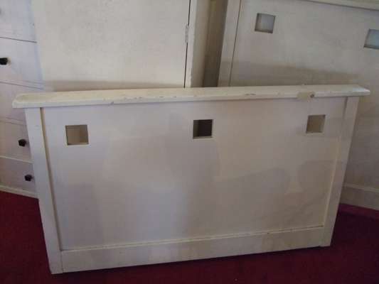 overpainted wood and stained, mirrored and leaded glass, comprising a wardrobe, the overhanging cornice above central stained and leaded glass panel and six drawers flanked by two cupboard doors, 165cm wide; also a chest of drawers, the superstructure with open shelves and single cupboard door above an arrangement of seven drawers,122cm wide, 137cm high; a dressing table with tall central mirror and twin pedestals of two drawers with panelled door below, 94.5cm wide 176 high; and a matching double bed en suite,131 wide, 206 long (5)
