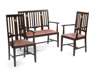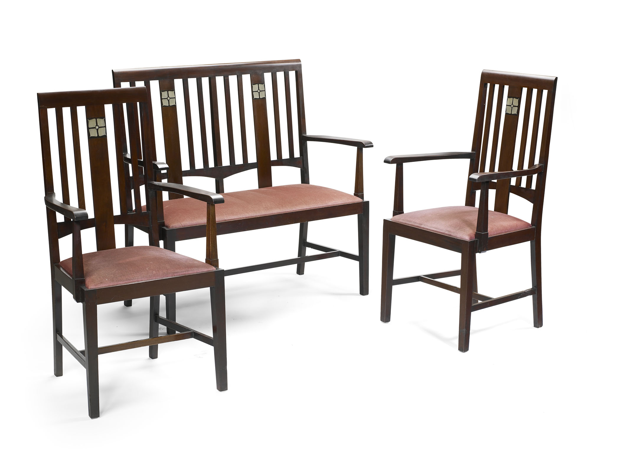 inlaid mahogany, comprising a sofa and two matching armchairs, each with splat backs inlaid with pewter flowerheads above drop-in seats and square section tapering legs linked by stretchers (3)