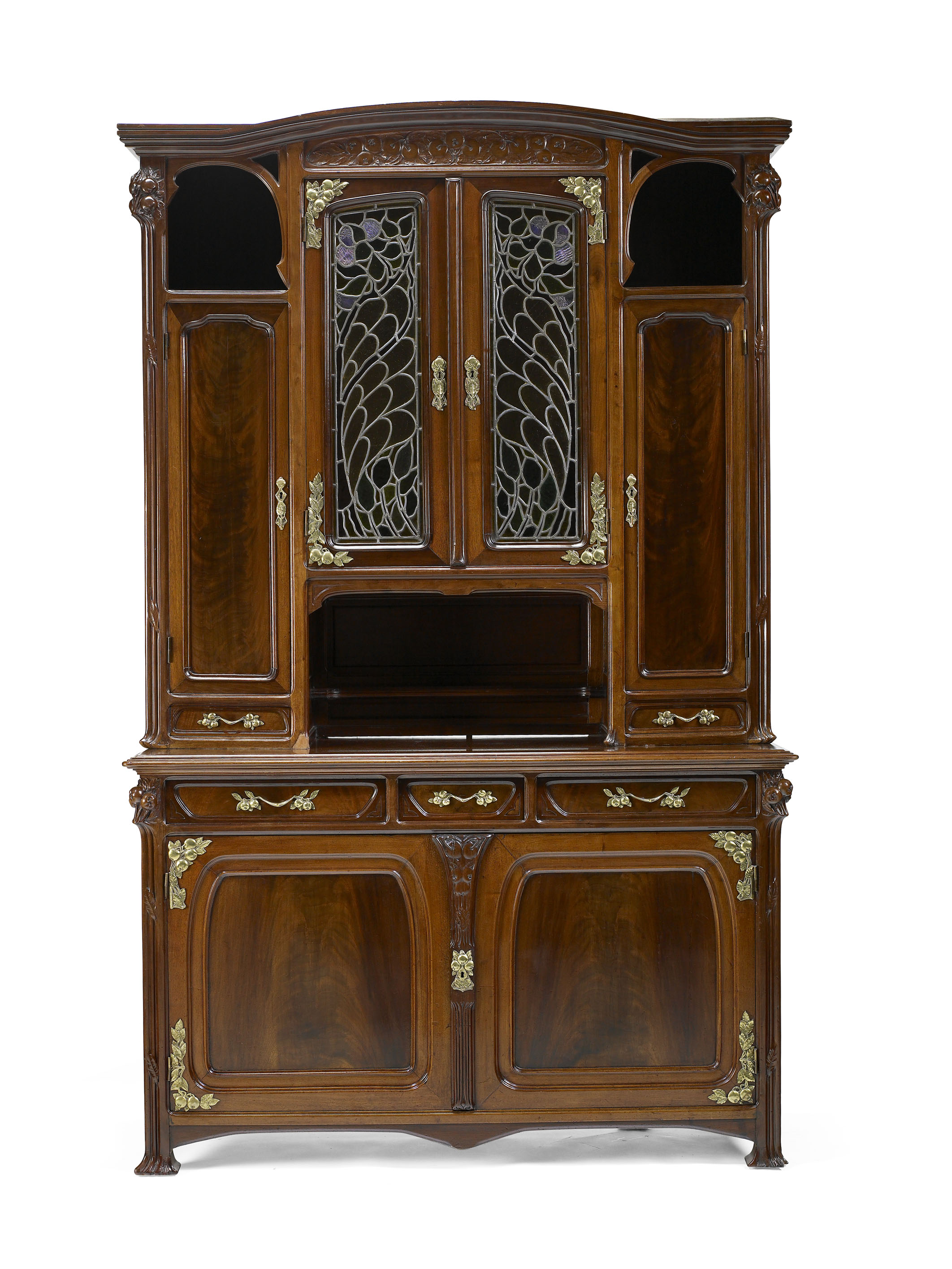 mahogany, the moulded cornice above a fruit-carved frieze and a pair of stained and leaded glass doors with decorative brass hinges, flanked by open shelves and two panelled doors and enclosed by carved and moulded angles, the base with three drawers and twin panelled doors below raised on bracket feet
