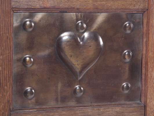 oak and brass, the panelled sides repoussé decorated above square supports linked by stretchers