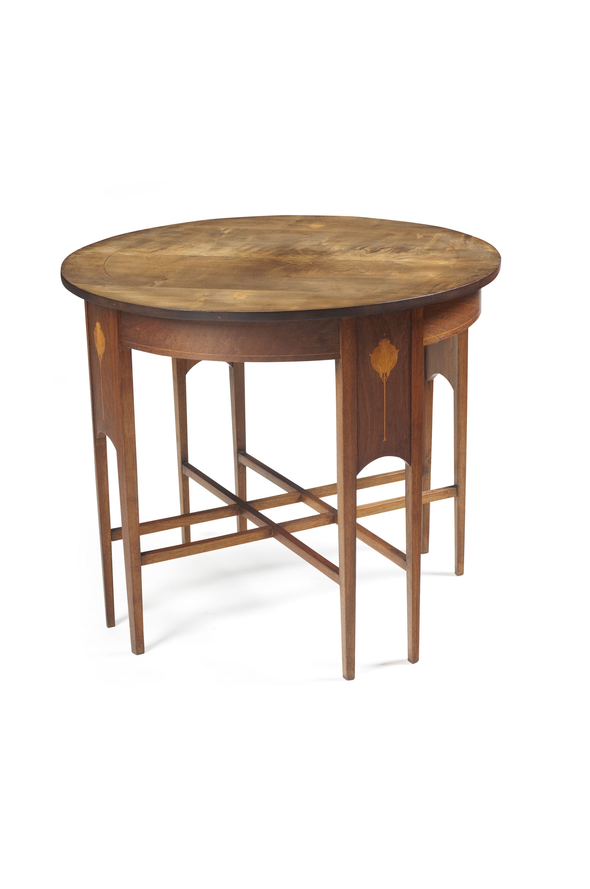 inlaid mahogany, the circular quarter veneered top with flowerhead inlay above four twin column supports with infill panels inlaid with corresponding floral motifs and linked by double cross stretchers, bears makers label