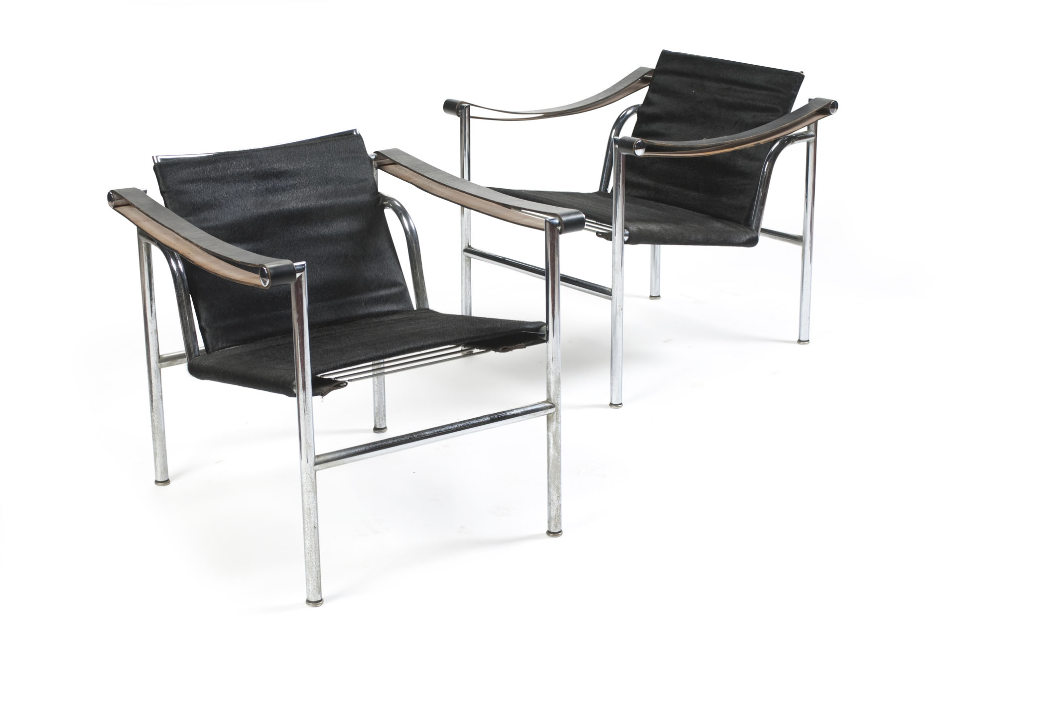 chromed bent tubular steel frame, black ponyskin seat and back with slung leather arms, signed and numbered on the frame, probably Cassina, post 1950 (2)
