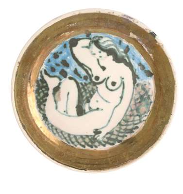 painted and glazed porcelain, with gilded decoration, depicting a naked male and female, incised marks (2)