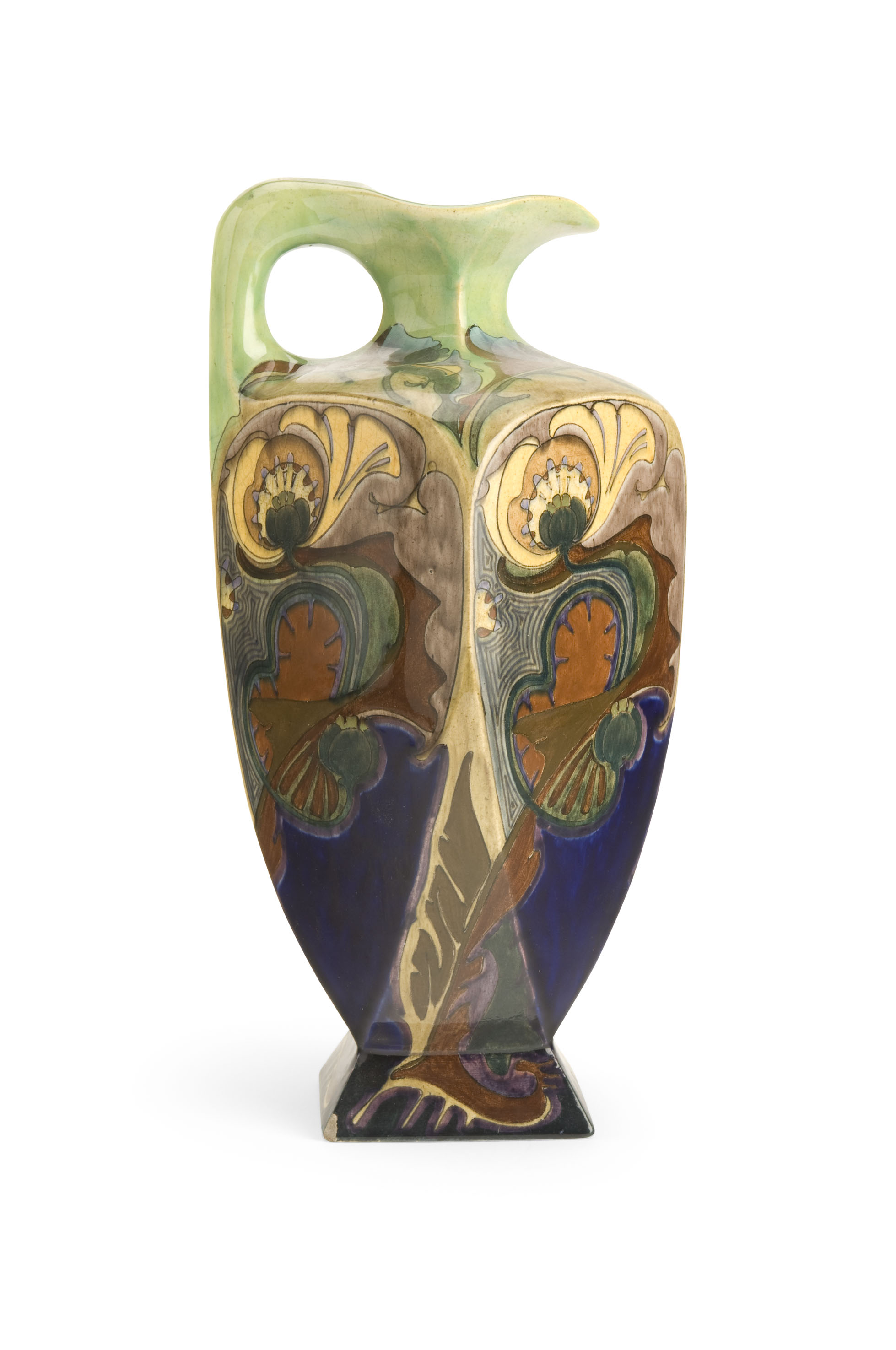glazed stoneware, of tapered square section, painted with stylised flowering plants, footed base, painted marks 'Rozenburg/ Den Haag/ 504' with anchor date mark for 1899-1900, incised mark 'W123V'