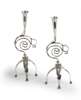each with gently tapering nozzles above spirally scrolled supports terminating in a carrying handle, raised above a sphere on four pierced and curved legs with scroll feet, hallmarked Birmingham 1899 (2)